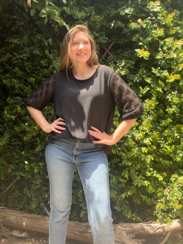 Blusa lisa cuello redondo de crep con manguitas 3/4 de encaje bordado tipo broderie